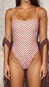 A retro-inspired take on swimwear, this red and white chevron stripe one-piece delivers timeless summer appeal. Featuring a square neckline, slim straps that tie at the back, a flattering high-cut leg, and a cheeky back, it’s fully lined with removable pads for effortless beach-to-pool style.
