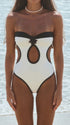 Black and white, but never quiet. This striking monokini features a sculpted sweetheart neckline with detachable slim straps, removable pads, contrast trim, and a 3D flower center. Curved waist cutouts sculpt the silhouette while the Brazilian scrunch back highlights the hips.