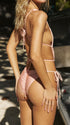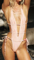 This ultra-sexy one-piece swimwear features a deep V neckline, removable pads, daring cut-outs, high-cut legs, and a ruched, body-sculpting fit. Cheeky gathered back with beaded tie sides completes a barely-there, Instagram-ready look. Glossy fabric makes sun-kissed skin glow.