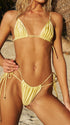 City life fades the moment this soft yellow two-piece swimsuit hits the water. The sliding triangle swim top features removable pads and strappy ties, paired with a low-rise double tie-side swim bottom and a scrunch cheeky back. Stretchy, glossy fabric moves effortlessly from swim to party.