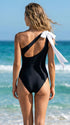 Tie a bold contrast bow atop this one shoulder black one piece, cascading elegantly along the shoulder. The asymmetric neckline with removable pads and a sculpted back cut out enhance curves, while smooth stretch fabric and moderate coverage create a minimalist, confident beach silhouette.