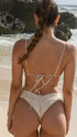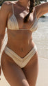 Bring island vibes in this sexy two-piece swimsuit. The ruched sliding triangle swim top with spaghetti straps, self-ties, and soft pads pairs with a high-cut scrunch-back swim bottom with V-shaped ruched waistband for a shiny, confident city-to-beach look.
