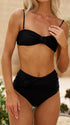 Check out this gorgeous two-piece swimsuit! The rose-shaped detail on the padded bandeau bikini top with optional spaghetti straps and back tie adds sweetness. The high-waisted bikini bottom with gathered back flatters and cinches, featuring the same rose accent for a coordinated holiday look.