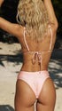 Shiny and sexy, this Brazilian two-piece bikini set is made for city-to-beach style. The sliding triangle swim top features a ruched front, soft pads, and a tie-back closure. The high-waisted, V-cut wide-leg swim bottoms with a scrunch cheeky back lift and flatter your figure for a confident look.