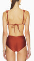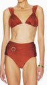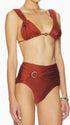 Your summer getaway awaits in this luxe brown two-piece swimsuit. The ruched triangle bikini top with gold ring, removable pads, wide straps, and back tie pairs with a high-rise bikini bottom with a moderated gathered back and metal ring. Retro, flattering, and resort-ready.