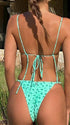 Fresh and tropical, this sexy mint green palm-print two-piece swimsuit shows just enough skin. The bandeau-style bikini top features spaghetti straps and back ties, while the low-rise bikini bottom with a high-leg cut and ruched details hugs comfortably from poolside to beach strolls.