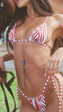 Jet-set ready in this nostalgic red-and-white striped two-piece. Sexy sliding triangle swim top with halter & back ties, removable padding, paired with sliding ruched swim bottom with adjustable side ties and golden toggles. Playful, retro strappy design, fully lined to flatter every curve.